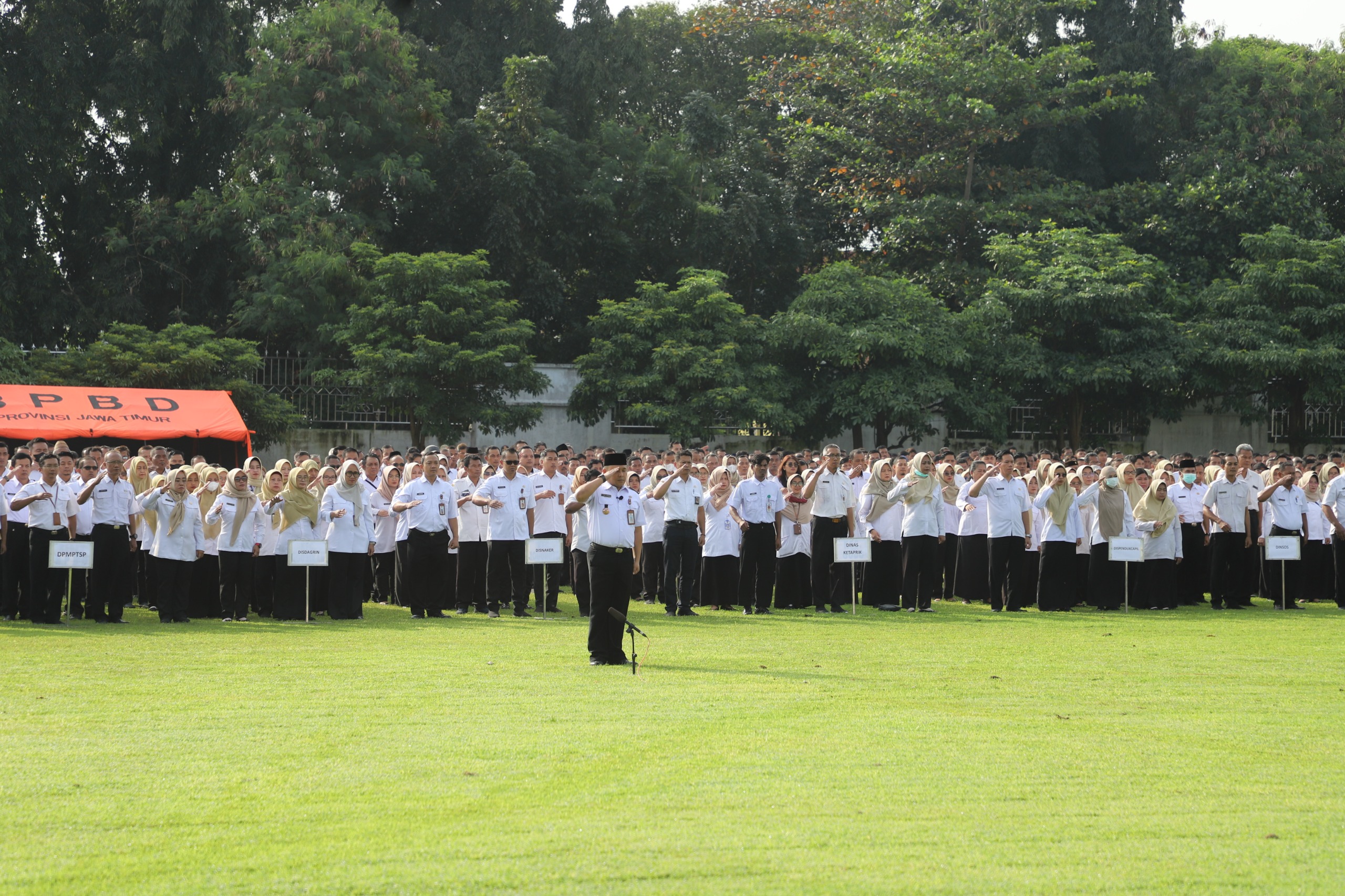 Acara ini dipimpin langsung oleh Bupati Jombang, Warsubi, S.H., M.Si., dan dihadiri oleh Wakil Bupati Jombang Gus Salmanudin, S.Ag., M.Pd., Dansatradar Dansatradar 405 Ploso,Letkol Lek Bayu Ardiansyah, S.T., M.Tr.S.O.U., M.Han, Sekretaris Daerah Agus Purnomo, S.H., M.Si., serta seluruh Kepala Perangkat Daerah, Ketua Tim Penggerak PKK Kabupaten Jombang Yuliati Nugrahani Warsubi, Ning Ema Erfina Salmanudin, Ketua DWP Kabupaten Jombang Lilik Agus Purnomo dan ribuan karyawan di lingkup Pemkab Jombang.