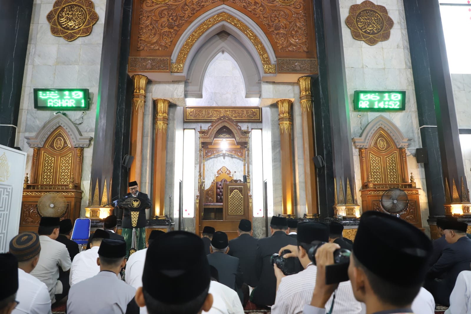 Rombongan Bupati Jombang menuju masjid berjalan kaki dari Pendopo Kabupaten Jombang. Bupati Jombang, Warsubi, tampak hadir didampingi Ketua TP PKK Kabupaten Jombang, Yuliati Nugrahani Warsubi, bersama jajaran Forkopimda, termasuk Wakil Bupati Gus Salmanudin, Ketua DPRD Hadi Atmaji, serta jajaran pimpinan instansi vertikal lainnya.