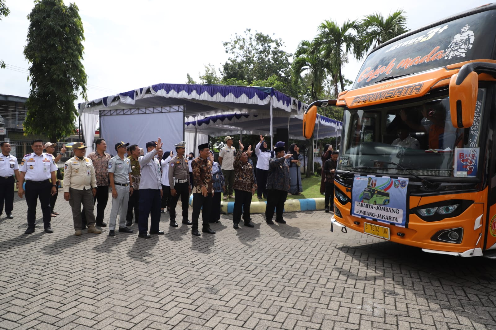 Peserta Arus Balik Lebaran Gratis dilepas langsung oleh Wakil Bupati Jombang, Gus Salmanudin, S.Ag., M.Pd., Sekretaris Daerah Agus Purnomo, S.H., M.Si, perwakilan Dinas Perhubungan (Dishub) Provinsi Jawa Timur, Asisten, perwakilan Forkopimda, serta jajaran Kepala OPD terkait.