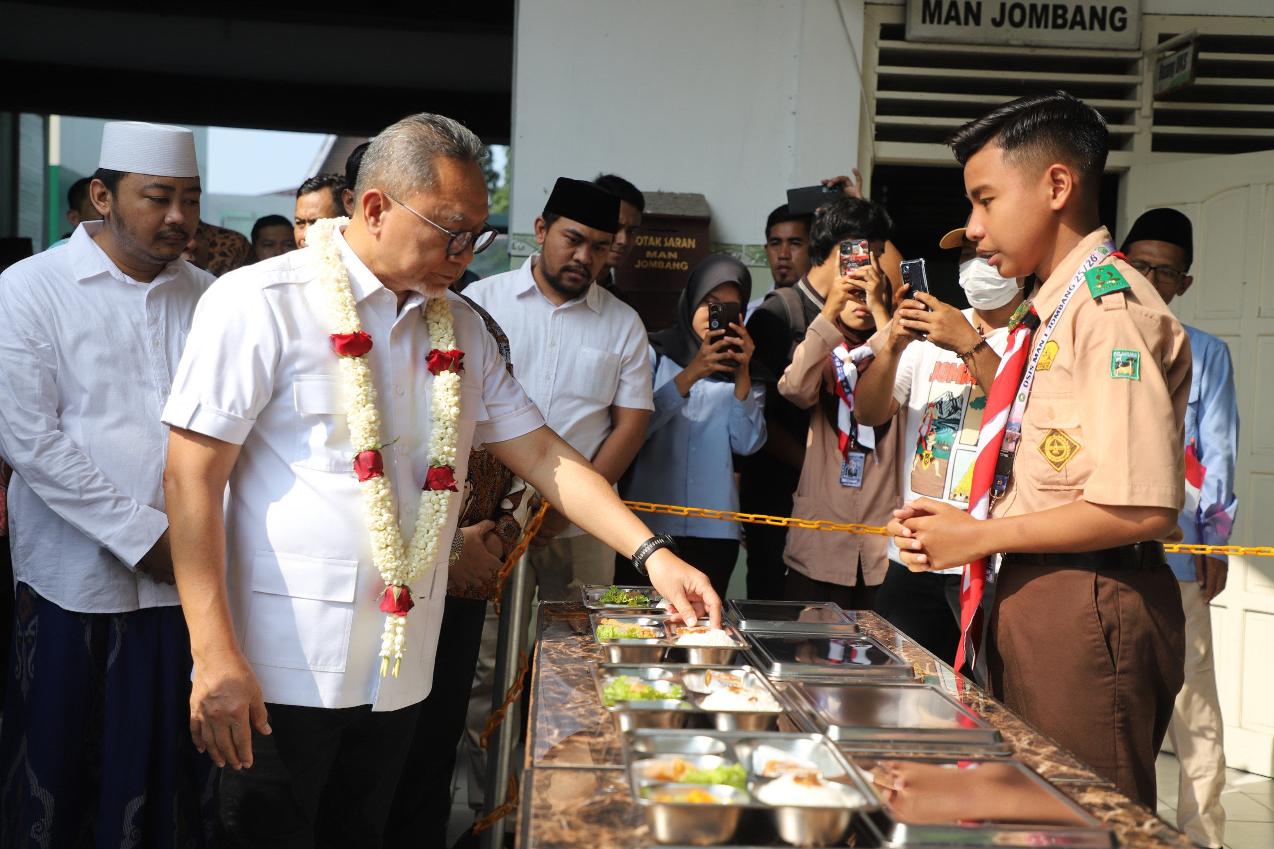 Jombang – Jatimkita.com, Menteri Koordinator Bidang Pangan RI, Dr. H. Zulkifli Hasan, S.E., M.M., bersama Bupati Jombang, Warsubi, S.H., M.Si., meninjau langsung implementasi Program Makan Bergizi Gratis (MBG) di sejumlah satuan pendidikan di Kabupaten Jombang, Jumat (10/04/2026) pagi.